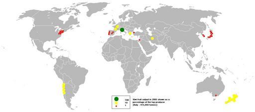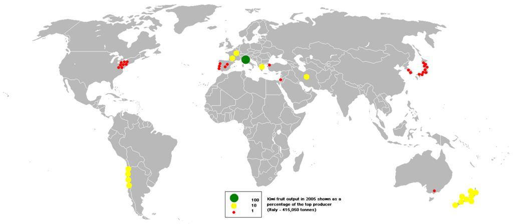 | Keywords: 2005kiwi fruit.PNG This bubble map shows the global distribution of kiwifruit output in 2005 as a percentage of the top producer Italy - 415 050 tonnes This map is consistent with incomplete set of data too as long as the top producer is known It resolves the accessibility issues faced by colour-coded maps that may not be properly rendered in old computer screens Data was extracted on 9th June 2007 from http //faostat fao org/site/336/DesktopDefault aspx PageID 336 05 38 9 June 2007 w User Anwar_saadat who was the original uploader on Wikipedia economic map Kiwifruits 2005 maps Bubble maps |