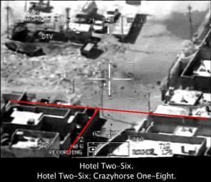 | Keywords: 2007-07-12 sun measurement.png Gun camera footage of the airstrike of 12 July 2007 in Baghdad showing the slaying of Namir Noor-Eldeen and a dozen other civilians by an US helicopter One frame from 5 00 of this video has been used to measure the position of the sun The red lines should mark due east-west and due north-south From examination of the Google Earth version of the map at the coordinates given in the Wikipedia article it appears clear that the scene is being viewed from the north Measurements taken were that the east-west line was +540x +50y; the north-south line was -85x +121y; and the telephone pole shadow was +87x +23y where x y are pixels from the upper left corner These were calculated to mean that the angle of the pole was at tan-1 0 15 and that the sun is 8 5 degrees south of due east Using this angle the equation of time to subtract 6 minutes from the local time and the longitude of Baghdad to subtract 2 minutes to make it a UTC+3 local time zone I calculated a time of 6 26 a m not counting daylight savings time The footage reads 06 23 22 On this basis I believe the helicopter footage is in local time not in GMT standard time Note that this conflicts with the U S Army report see http //en wikipedia org/wiki/Talk July_12 _2007_Baghdad_airstrike Inaccurate_time Note that this original research cannot be cited or used in the Wikipedia article by itself but supports a search for other sources July_12 _2007_Baghdad_airstrike_unedited_part1 ogv 2010-04-09 23 25 UTC July_12 _2007_Baghdad_airstrike_unedited_part1 ogv US Apache helicopter derivative work Wnt <span class signature-talk >talk</span> PD-USGov original upload log This image is a derivative work of the following images File July_12 _2007_Baghdad_airstrike_unedited_part1 ogv licensed with PD-USGov 2010-04-08T06 36 12Z Mahanga 720x576 90341681 Bytes <nowiki> Gun camera footage of the airstrike of 12 July 2007 in Baghdad showing the slaying of Namir Noor-Eldeen and a doze</nowiki> Uploaded with derivativeFX July_12 _2007_Baghdad_airstrike_unedited_part1 ogv US Government Crazyhorse 18 with lines marked by Wnt 2007-07-12 PD-USGov Baghdad 2007-07-12 airstrike pictures |