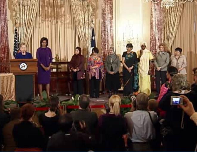 Keywords: 2009 International Women of Courage Award.png en Mar 11 2009 Secretary of State Hillary Rodham Clinton hosted the 3rd annual International Women of Courage Awards ceremony with guest speaker First Lady Michelle Obama in the Ben Franklin Room at the State Department Left to right Secretary of State Hillary Rodham Clinton First Lady Michelle Obama Wazhma Frogh - Afghanistan Norma Cruz - Guatemala Suaad Abbas Salman Allami - Iraq Ambiga Sreenevasan - Malaysia Hadizatou Mani - Niger Veronika Marchenko - Russia Mutabar Tadjibayeva - Uzbekistan 2009-03-11 http //video state gov/en/video/15389713001 U S Government Department of State other versions PD-USGov Uploaded with UploadWizard 2009 International Women of Courage Award |