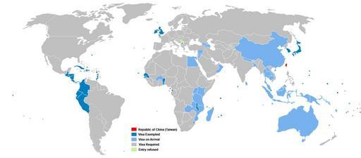 | Keywords: 2009ROCVisafree-v2.png Visa Free access map of Taiwan passport 2009 2009ROCVisafree png 2009-11-03 03 11 UTC 2009ROCVisafree png Original uploader was Noblesham derivative work Hmliaw <span class signature-talk >talk</span> 2009ROCVisafree png </nowiki> 2009-06-24T06 05 48Z Hmliaw 1425x625 22758 Bytes <nowiki>Added Ireland</nowiki> 2009-06-22T20 07 19Z Hmliaw 1425x625 22752 Bytes <nowiki>Updated visa categories</nowiki> 2009-06-22T20 06 39Z Hmliaw 1425x625 22752 Bytes <nowiki>Updated categories of visa travel</nowiki> 2009-06-02T11 31 13Z Passportguy 1425x625 34405 Bytes <nowiki>Reverted to version as of 18 13 1 June 2009</nowiki> 2009-06-02T07 53 12Z Jjhcap99 1425x625 34358 Bytes <nowiki>revert</nowiki> 2009-06-01T18 13 21Z Passportguy 1425x625 34405 Bytes <nowiki>- Rwanda</nowiki> 2009-06-01T18 12 10Z Passportguy 1425x625 34398 Bytes <nowiki>Syria iran BF RW all require pre-travel arrangements thus not VOA</nowiki> 2009-06-01T17 11 55Z Jjhcap99 1425x625 34358 Bytes <nowiki>Burkina Faso Iran and Syria to Viaa-free or Visa on Arrival</nowiki> 2009-06-01T17 02 37Z Jjhcap99 1425x625 34398 Bytes <nowiki>Mainland China to Taiwan residents only</nowiki> 2009-06-01T16 57 24Z Jjhcap99 1425x625 34255 Bytes <nowiki>new version</nowiki> 2009-05-15T18 45 34Z Passportguy 1425x625 33854 Bytes <nowiki>update several countries</nowiki> 2009-03-09T06 50 12Z Hmliaw 1425x625 33980 Bytes <nowiki> Visa Free access map of Taiwan passport 2009 Wikipedia Commons 2007-08-23 original upload date of the original file Original uploader was Noblesham Released int</nowiki> 2009-03-09T05 40 10Z Hmliaw 1425x625 33942 Bytes <nowiki> Visa Free access map of Taiwan passport 2009 Wikipedia Common 2007-08-23 original upload date of the original file Original uploader was Noblesham Released i</nowiki> 2009-03-05T19 25 51Z Hmliaw 1425x625 33830 Bytes <nowiki> Visa Free access map of Taiwan passport 2009 Wikipedia Common 2007-08-23 original upload date of the original file Original uploader was Noblesham edited by hmliaw Permi</nowiki> 2009-02-17T15 57 40Z Hmliaw 1425x625 33888 Bytes <nowiki> Updated Pacific and Caribbean Islands</nowiki> 2009-02-13T19 55 03Z Hmliaw 1425x625 33779 Bytes <nowiki> Visa Free access map of Taiwan passport 2009 Wikipedia Common 2007-08-23 original upload date of the original file Original uploader was Noblesham Release</nowiki> Uploaded with derivativeFX Uncategorized 2014 June 9 |