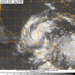 | Keywords: 20101025.0045.goes13.x.ir1km bw.19LRICHARD.80kts-981mb-172N-882W.100pc.jpg This is an infrared image of Hurricane Richard at peak intensity and making landfall on Belize taken by the GOES-13 spacecraft Leading up to this photograph Richard had strengthened rapidly and radar imagery showed a closed eyewall In this photo Richard has windspeeds of 90 mph and a minimum pressure of 981 mbar Eventually Richard dissipated in the Bay of Campeche Mouse over the image for information http //199 9 2 143/tcdat/tc10/ATL/19L RICHARD/ir/geo/1km_bw/ 2010-10-25 GOES-13; US Navy PD-USGov-Military-Navy ImageNote 1 666 119 357 203 1024 1024 2 Cuba ImageNoteEnd 1 ImageNote 2 391 329 242 276 1024 1024 2 Hurricane Richard ImageNoteEnd 2 ImageNote 3 806 2 201 116 1024 1024 2 South Florida ImageNoteEnd 3 ImageNote 4 314 486 174 227 1024 1024 2 Guatemala ImageNoteEnd 4 ImageNote 5 565 323 29 24 1024 1024 2 Cozumel ImageNoteEnd 5 ImageNote 6 427 654 171 94 1024 1024 2 El Salvador ImageNoteEnd 6 ImageNote 7 464 577 328 125 1024 1024 2 Honduras ImageNoteEnd 7 ImageNote 8 502 643 311 227 1024 1024 2 Nicaragua ImageNoteEnd 8 ImageNote 9 836 341 150 101 1024 1024 2 Cayman Islands ImageNoteEnd 9 ImageNote 10 614 853 237 102 1024 1024 2 Costa Rica ImageNoteEnd 10 ImageNote 11 2 2 321 49 1024 1024 2 Date and Subject Information ImageNoteEnd 11 ImageNote 12 2 956 1021 34 1024 1024 2 Information ImageNoteEnd 12 ImageNote 13 2 997 1021 22 1024 1024 2 Infrared Legend ImageNoteEnd 13 ImageNote 14 459 445 65 114 1024 1024 2 Belize ImageNoteEnd 14 ImageNote 15 7 585 309 370 1024 1024 2 Pacific Ocean ImageNoteEnd 15 ImageNote 16 290 683 360 270 1024 1024 2 Pacific Ocean ImageNoteEnd 16 ImageNote 17 585 270 432 338 1024 1024 2 Caribbean Sea ImageNoteEnd 17 ImageNote 18 7 212 384 237 1024 1024 2 Bay of Campeche ImageNoteEnd 18 ImageNote 19 783 616 237 311 1024 1024 2 Caribbean Sea ImageNoteEnd 19 ImageNote 20 20 53 787 162 1024 1024 2 Gulf of Mexico ImageNoteEnd 20 ImageNote 21 9 259 302 401 1024 1024 2 Mexico ImageNoteEnd 21 ImageNote 22 370 266 179 203 1024 1024 2 Yucatan Peninsula ImageNoteEnd 22 Hurricane Richard 2010 |