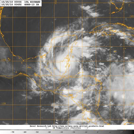 Keywords: 20101025.0045.goes13.x.ir1km bw.19LRICHARD.80kts-981mb-172N-882W.100pc.jpg This is an infrared image of Hurricane Richard at peak intensity and making landfall on Belize taken by the GOES-13 spacecraft Leading up to this photograph Richard had strengthened rapidly and radar imagery showed a closed eyewall In this photo Richard has windspeeds of 90 mph and a minimum pressure of 981 mbar Eventually Richard dissipated in the Bay of Campeche Mouse over the image for information http //199 9 2 143/tcdat/tc10/ATL/19L RICHARD/ir/geo/1km_bw/ 2010-10-25 GOES-13; US Navy PD-USGov-Military-Navy ImageNote 1 666 119 357 203 1024 1024 2 Cuba ImageNoteEnd 1 ImageNote 2 391 329 242 276 1024 1024 2 Hurricane Richard ImageNoteEnd 2 ImageNote 3 806 2 201 116 1024 1024 2 South Florida ImageNoteEnd 3 ImageNote 4 314 486 174 227 1024 1024 2 Guatemala ImageNoteEnd 4 ImageNote 5 565 323 29 24 1024 1024 2 Cozumel ImageNoteEnd 5 ImageNote 6 427 654 171 94 1024 1024 2 El Salvador ImageNoteEnd 6 ImageNote 7 464 577 328 125 1024 1024 2 Honduras ImageNoteEnd 7 ImageNote 8 502 643 311 227 1024 1024 2 Nicaragua ImageNoteEnd 8 ImageNote 9 836 341 150 101 1024 1024 2 Cayman Islands ImageNoteEnd 9 ImageNote 10 614 853 237 102 1024 1024 2 Costa Rica ImageNoteEnd 10 ImageNote 11 2 2 321 49 1024 1024 2 Date and Subject Information ImageNoteEnd 11 ImageNote 12 2 956 1021 34 1024 1024 2 Information ImageNoteEnd 12 ImageNote 13 2 997 1021 22 1024 1024 2 Infrared Legend ImageNoteEnd 13 ImageNote 14 459 445 65 114 1024 1024 2 Belize ImageNoteEnd 14 ImageNote 15 7 585 309 370 1024 1024 2 Pacific Ocean ImageNoteEnd 15 ImageNote 16 290 683 360 270 1024 1024 2 Pacific Ocean ImageNoteEnd 16 ImageNote 17 585 270 432 338 1024 1024 2 Caribbean Sea ImageNoteEnd 17 ImageNote 18 7 212 384 237 1024 1024 2 Bay of Campeche ImageNoteEnd 18 ImageNote 19 783 616 237 311 1024 1024 2 Caribbean Sea ImageNoteEnd 19 ImageNote 20 20 53 787 162 1024 1024 2 Gulf of Mexico ImageNoteEnd 20 ImageNote 21 9 259 302 401 1024 1024 2 Mexico ImageNoteEnd 21 ImageNote 22 370 266 179 203 1024 1024 2 Yucatan Peninsula ImageNoteEnd 22 Hurricane Richard 2010 |