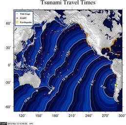 | Keywords: 2010 Pichilemu earthquake - tsunami travel time map.jpg en A strong earthquake with a moment magnitude of 6 9 USGS magnitude occurred at 11 39 44 UTC 11 March 2010 day 070 and was located 85 miles/140 km SSW of Valparaiso Chile 34 259S 71 929W 6 8mi/11 0km depth--USGS location This earthquake produced a tsunami that was recorded at tide gages monitored at the Tsunami Warning Centers Many observatories provide data to the centers; such as the NOAA National Ocean Service the U of Hawaii Sea Level Center the Chilean Navy and the National Tidal Facility in Australia among others Click on the site name to see a graph of the tsunami when available Listed wave heights are maximum amplitude in cm above sea level Observed Arrival time is the actual tsunami arrival time in UTC on gages where it could be determined The Computed Arrival time is the estimated time of arrival computed at the National Tsunami Warning Center NTWC based on the origin time and location The Sample Interval column shows the time between samples 2010-03-11 http //wcatwc arh noaa gov/previous events/3-11-10-Chile/Tsunami-03-11-10 htm NOAA PD-USGov Uploaded with UploadWizard 2010 Pichilemu earthquake Files uploaded by Diego Grez-CaƱete |