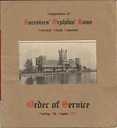 | Keywords: 1900s orphanage independent order of foresters independentorderofforesters text Front cover of order of service for the inauguration of the Foresters' Orphans' home, Foresters' Island, Deseronto, Ontario, Sunday 6th August, 1905. Front cover of order of service for the inauguration of the Foresters' Orphans' home, Foresters' Island, Deseronto, Ontario, Sunday 6th August, 1905. |