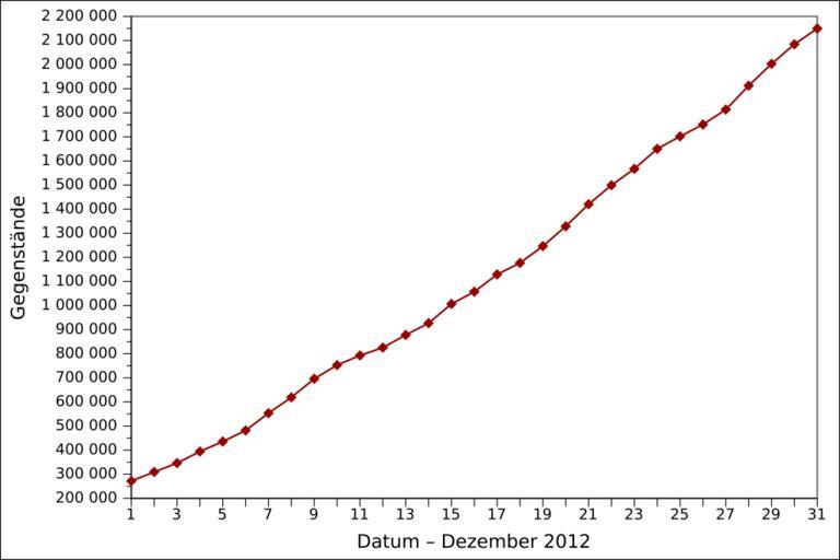 | Keywords: 2012-12 Wikidata items DE.svg de Grafische Darstellung des vollständigen Anzahls der angelegten Gegenstände auf Wikidata in Dezember 2012 auf Deutsch Löschungen werden nicht berücksichtigt en Graph presenting the total number of items created on Wikidata as of December 2012 in German Item deletions are not taken into account fr Graphique en allemand représentant le nombre total d'éléments créés sur Wikidata en décembre 2012 Les suppressions d'éléments ne sont pas prises en compte 2012-12-08 15 16 54 own Ljubinka cc-zero en inline yes File 2012-12 Wikidata items EN svg fr inline yes File 2012-12 Wikidata items FR svg Wikidata statistics in December 2012 Wikidata statistics in German |
