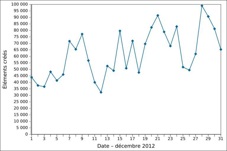 | Keywords: 2012-12 Wikidata item creation FR.svg de Grafische Darstellung des täglichen Anzahls der in Dezember 2012 angelegten Gegenstände auf Wikidata auf Französisch Löschungen werden nicht berücksichtigt en Graph presenting the number of items created daily on Wikidata in December 2012 in French Item deletions are not taken into account fr Graphique en français représentant le nombre d'éléments créés par jour sur Wikidata en décembre 2012 Les suppressions d'éléments ne sont pas prises en compte 2013-01-01 16 49 00 own Ljubinka cc-zero de inline yes File 2012-12 Wikidata item creation DE svg en inline yes File 2012-12 Wikidata item creation EN svg Wikidata statistics in December 2012 Wikidata statistics in French |