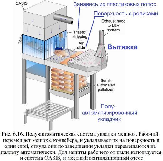 | Keywords: Обеспыливание 2012 Рис. 6.16. Полу-автоматическая система укладки мешков..jpg ru Иллюст ация к учебнику по обеспыливанию п и добыче и пе е аботке полезных мине альных ископаемых глава 6 а Рис 6 16 показана полу-автоматизи ованная система укладки мешков Рабочий защищённый от пыли системой OASIS снимает мешки с конвейе а и укладывает их на абочую пове хность откуда сфо ми ованный слой сг ужается на паллету en Figure 6 16 Semi-automated bag palletizing systems in which a worker removes bags from a conveyor and lifts and positions each layer on an air slide before automated loading onto the pallet Both an OASIS system and an exhaust ventilation system are used to lower the worker s dust exposure during this bag palletizing process 2015-02-06 http //www cdc gov/niosh/mining/works/coversheet1765 html Dust Control Handbook for Industrial Minerals Mining and Processing CDC 2012 Andrew B Cecala Andrew D O Brien Joseph Schall et al other versions Рис 6 16 Полу-автоматическая система укладки мешков Рабочий пе емещает мешок с конвейе а и укладывает их на пове хность в один слой откуда они по заве шении укладки пе емещаются на паллету автоматически Для защиты абочего от пыли используется и система OASIS и местный вентиляционный отсос PD-USGov Workplace safety Uploaded with UploadWizard |