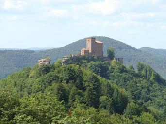 Keywords: 2012 Pfälzerwald 390 Trifels.JPG de Burg Trifels auf dem Sonnenberg im Wasgau/Pfälzerwald - Blick von der Ruine Scharfenberg/Münz own Steffen 962 2012-08-16 Sonnenberg Wasgau Trifels Castle Cc-zero