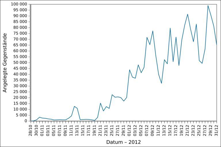 | Keywords: 2012 Wikidata item creation DE.svg de Grafische Darstellung des täglichen Anzahls der im Jahr 2012 angelegten Gegenstände auf Wikidata auf Deutsch Löschungen werden nicht berücksichtigt en Graph presenting the number of items created daily on Wikidata in 2012 in German Item deletions are not taken into account fr Graphique en allemand représentant le nombre d'éléments créés par jour sur Wikidata en 2012 Les suppressions d'éléments ne sont pas prises en compte 2013-01-01 17 34 35 own Ljubinka cc-zero en inline yes File 2012 Wikidata item creation EN svg fr inline yes File 2012 Wikidata item creation FR svg Wikidata statistics in 2012 Wikidata statistics in German |