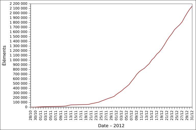 | Keywords: 2012 Wikidata items FR.svg de Grafische Darstellung des vollständigen Anzahls der angelegten Gegenstände auf Wikidata im Jahr 2012 auf Französisch Löschungen werden nicht berücksichtigt en Graph presenting the total number of items created on Wikidata as of 2012 in French Item deletions are not taken into account fr Graphique en français représentant le nombre total d'éléments créés sur Wikidata en 2012 Les suppressions d'éléments ne sont pas prises en compte 2013-01-01 17 34 23 own Ljubinka cc-zero File 2012 Wikidata items DE svg File 2012 Wikidata items EN svg Wikidata statistics in 2012 Wikidata statistics in French |