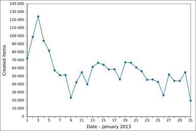 | Keywords: 2013-01 Wikidata item creation EN.svg de Grafische Darstellung des täglichen Anzahls der in Januar 2013 angelegten Gegenstände auf Wikidata auf Englisch Löschungen werden nicht berücksichtigt en Graph presenting the number of items created daily on Wikidata in January 2013 in English Item deletions are not taken into account fr Graphique en anglais représentant le nombre d'éléments créés par jour sur Wikidata en janvier 2013 Les suppressions d'éléments ne sont pas prises en compte 2013-02-01 16 45 00 own Ljubinka cc-zero de inline yes File 2013-01 Wikidata item creation DE svg fr inline yes File 2013-01 Wikidata item creation FR svg Wikidata statistics in January 2013 Wikidata statistics in English |