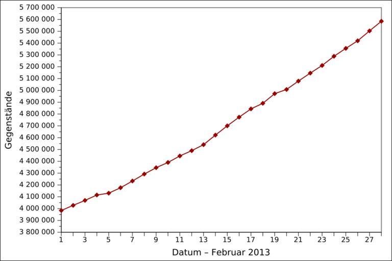 | Keywords: 2013-02 Wikidata items DE.svg de Grafische Darstellung des vollständigen Anzahls der angelegten Gegenstände auf Wikidata in Februar 2013 auf Deutsch Löschungen werden nicht berücksichtigt en Graph presenting the total number of items created on Wikidata as of February 2013 in German Item deletions are not taken into account fr Graphique en allemand représentant le nombre total d'éléments créés sur Wikidata en février 2013 Les suppressions d'éléments ne sont pas prises en compte 2013-03-01 16 07 own Ljubinka cc-zero en inline yes File 2013-02 Wikidata items EN svg fr inline yes File 2013-02 Wikidata items FR svg Wikidata statistics in February 2013 Wikidata statistics in German |