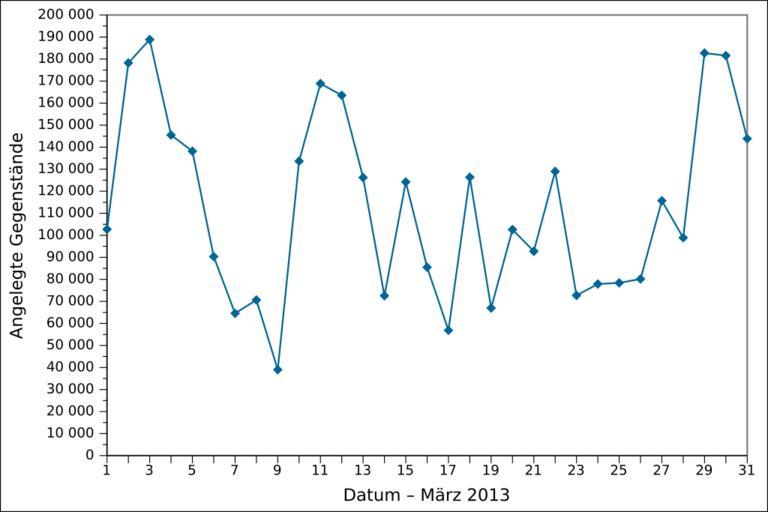 | Keywords: 2013-03 Wikidata item creation DE.svg de Grafische Darstellung des täglichen Anzahls der in März 2013 angelegten Gegenstände auf Wikidata auf Deutsch Löschungen werden nicht berücksichtigt en Graph presenting the number of items created daily on Wikidata in March 2013 in German Item deletions are not taken into account fr Graphique en allemand représentant le nombre d'éléments créés par jour sur Wikidata en mars 2013 Les suppressions d'éléments ne sont pas prises en compte 2013-04-01 21 28 own Ljubinka cc-zero en inline yes File 2013-03 Wikidata item creation EN svg fr inline yes File 2013-03 Wikidata item creation FR svg Wikidata statistics in March 2013 Wikidata statistics in German |