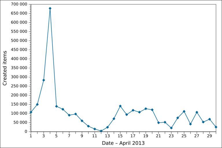 | Keywords: 2013-04 Wikidata item creation EN.svg de Grafische Darstellung des täglichen Anzahls der in April 2013 angelegten Gegenstände auf Wikidata auf Englisch Löschungen werden nicht berücksichtigt en Graph presenting the number of items created daily on Wikidata in April 2013 in English Item deletions are not taken into account fr Graphique en anglais représentant le nombre d'éléments créés par jour sur Wikidata en avril 2013 Les suppressions d'éléments ne sont pas prises en compte 2013-05-04 13 45 own Ljubinka cc-zero File 2013-04 Wikidata item creation DE svg File 2013-04 Wikidata item creation FR svg Wikidata statistics in April 2013 Wikidata statistics in English |