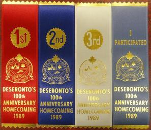 | Keywords: ribbons 1980s print text indoor Four ribbon awards from ‘Deseronto’s 100th Anniversary Homecoming 1989’, a red one for first prize, a dark blue for second prize, a white for third prize and a pale blue for ‘I particpated’. Donated by the Town of Deseronto, Ontario. Four ribbon awards from ‘Deseronto’s 100th Anniversary Homecoming 1989’, a red one for first prize, a dark blue for second prize, a white for third prize and a pale blue for ‘I particpated’. Donated by the Town of Deseronto, Ontario. |