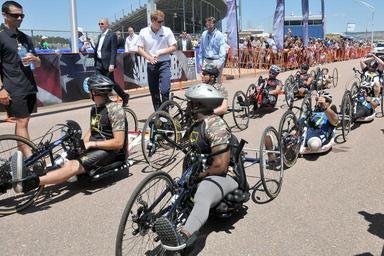 | Keywords: 2013 Warrior Games 130512-D-SC123-007.jpg en Prince Harry offers words of encouragement to Warrior Games cyclists representing their respective military branches before the men's recumbent bike cycling competition near the U S Air Force Academy in Colorado Springs Colo May 11 From May 11-16 more than 200 wounded ill and injured servicemembers and veterans from the U S Marines Army Air Force and Navy as well as a team representing U S Special Operations Command and an international team representing the United Kingdom will compete for the gold in track and field shooting swimming cycling archery wheelchair basketball and sitting volleyball at the U S Olympic Training Center and U S Air Force Academy The military service with the most medals will win the Chairman's Cup 2013-05-11 Shannon Collins https //www dvidshub net/image/931297 130512-D-SC123-007 2013-05-14 14 22 COLORADO SPRINGS CO US PD-USGov Prince Harry of Wales in 2013 U S Olympic Training Center Images from DoD uploaded by Fæ |