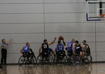 | Keywords: 2013 Warrior Games Wheelchair Basketball 130414-N-DT940-404.jpg en Team Navy/Coast Guard members strategically position themselves in a game of wheelchair basketball against Team Air Force during the 2013 Warrior Games May 14 The Warrior Games includes competitions in archery cycling seated volleyball shooting swimming track and field and wheelchair basketball The goal of the Warrior Games is not necessarily to identify the most skilled athletes but rather to demonstrate the incredible potential of wounded warriors through competitive sports More than 200 wounded ill or injured service members from the U S and U K armed forces are scheduled to compete in the Paralympics-style competition May 11-16 U S Navy photo by Mass Communication Specialist 1st Class Erica R Gardner/Released 2013-05-14 Petty Officer 1st Class Erica R Gardner https //www dvidshub net/image/932373 130414-N-DT940-404 2013-05-15 13 51 COLORADO SPRINGS CO US PD-USGov-Military-Navy 2013 Warrior Games Images from DoD uploaded by Fæ |