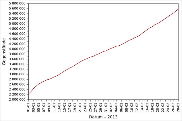 | Keywords: 2013 Wikidata items DE.svg de Grafische Darstellung des vollständigen Anzahls der angelegten Gegenstände auf Wikidata im Jahr 2013 auf Deutsch Löschungen werden nicht berücksichtigt en Graph presenting the total number of items created on Wikidata as of 2013 in German Item deletions are not taken into account fr Graphique en allemand représentant le nombre total d'éléments créés sur Wikidata en 2013 Les suppressions d'éléments ne sont pas prises en compte 2013-03-01 16 27 11 own Ljubinka cc-zero en inline yes File 2013 Wikidata items EN svg fr inline yes File 2013 Wikidata items FR svg Wikidata statistics in 2013 Wikidata statistics in German |