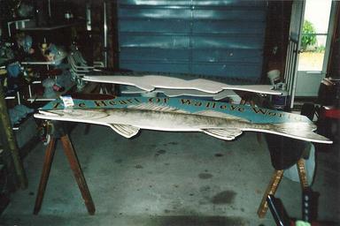 | Keywords: fish art 2000s One of a series of photographs taken by Diane Myers of work in progress on two of the three 'Heart of Walleye World' signs which she painted in 2006 to replace two older signs which had become damaged. These signs stood at the entrances to Deseronto, Ontario, for a number of years. One of a series of photographs taken by Diane Myers of work in progress on two of the three 'Heart of Walleye World' signs which she painted in 2006 to replace two older signs which had become damaged. These signs stood at the entrances to Deseronto, Ontario, for a number of years. |