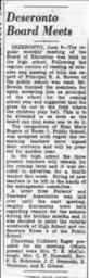 | Keywords: schools deseronto public school deserontopublicschool deseronto high school deserontohighschool blackandwhite monochrome text black and white News clipping of a report from the Kingston Whig Standard on the regular monthly meeting of the Deseronto Board of Education, held at Deseronto High School, Ontario on June 6th, 1944. Items covered in the meeting included a request from Principal R. A. Bowen for the grass to be cut in the field of the Public School where the children played ball and the resignation of Miss Mary Rogers of Room 1, Public School. The chairman of the Board was Cuthbert Sager. Other members included Mrs. T. R. McCullough, Mrs. C. F. Dummell, Rev. F. G. Robinson, J. C. Reynolds, R. Wessman and E. Gibson. Donated to the Archives in July 2014 by Bev Boomhour. News clipping of a report from the Kingston Whig Standard on the regular monthly meeting of the Deseronto Board of Education, held at Deseronto High School, Ontario on June 6th, 1944. Items covered in the meeting included a request from Principal R. A. Bowen for the grass to be cut in the field of the Public School where the children played ball and the resignation of Miss Mary Rogers of Room 1, Public School. The chairman of the Board was Cuthbert Sager. Other members included Mrs. T. R. McCullough, Mrs. C. F. Dummell, Rev. F. G. Robinson, J. C. Reynolds, R. Wessman and E. Gibson. Donated to the Archives in July 2014 by Bev Boomhour. |