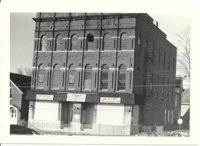 Keywords: 1980s monochrome architecture outdoor Photograph of the former Colp Block on the southwest corner of St. George and Edmon Streets in Deseronto, Ontario. The building was torn down in the early 1980s. Signs on the first floor of the building read "Groceries Pop & Ice Cream", "Family Corner" and "Solid State Colour Servicing". Photograph of the former Colp Block on the southwest corner of St. George and Edmon Streets in Deseronto, Ontario. The building was torn down in the early 1980s. Signs on the first floor of the building read "Groceries Pop & Ice Cream", "Family Corner" and "Solid State Colour Servicing". |