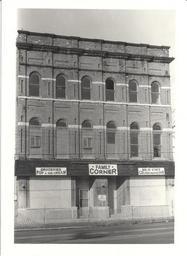 | Keywords: 1980s photo border outdoor Photograph of the former Colp Block on the southwest corner of St. George and Edmon Streets in Deseronto, Ontario. The building was torn down in the early 1980s. Signs on the first floor of the building read "Groceries Pop & Ice Cream", "Family Corner" and "Solid State Colour Servicing". Photograph of the former Colp Block on the southwest corner of St. George and Edmon Streets in Deseronto, Ontario. The building was torn down in the early 1980s. Signs on the first floor of the building read "Groceries Pop & Ice Cream", "Family Corner" and "Solid State Colour Servicing". |