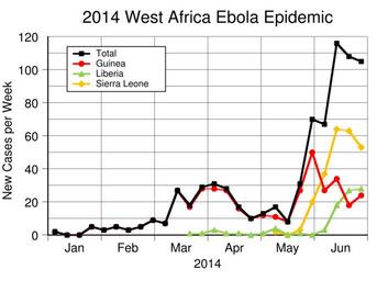 | Keywords: 2014 West Africa Ebola Epidemic - New Cases per Week January - June.svg en New cases of Ebola in West Africa each week from January to June 2014 Data from WHO http //www who int/csr/disease/ebola/situation-reports/en/ m 20141126 Situation report 2014-11-27 own Delphi234 other versions Generated with Wikimedia SVG Chart SVG Chart/box Data wikitable sortable Week ending Guinea Liberia Sierra Leone Total - 01/05/14 2 2 - 01/12/14 0 0 - 01/19/14 0 0 - 01/26/14 5 5 - 02/02/14 3 3 - 02/09/14 5 5 - 02/16/14 3 3 - 02/23/14 5 5 - 03/02/14 9 9 - 03/09/14 7 7 - 03/16/14 27 27 - 03/23/14 17 1 18 - 03/30/14 28 1 29 - 04/06/14 28 3 31 - 04/13/14 27 1 28 - 04/20/14 16 1 17 - 04/27/14 10 0 10 - 05/04/14 12 1 13 - 05/11/14 11 4 2 17 - 05/18/14 8 0 0 8 - 05/25/14 27 1 3 31 - 06/01/14 50 0 20 70 - 06/08/14 27 3 37 67 - 06/15/14 34 18 64 116 - 06/22/14 18 27 63 108 - 06/29/14 24 28 53 105 cc-zero Uploaded with UploadWizard 2014 Ebola outbreak statistics |