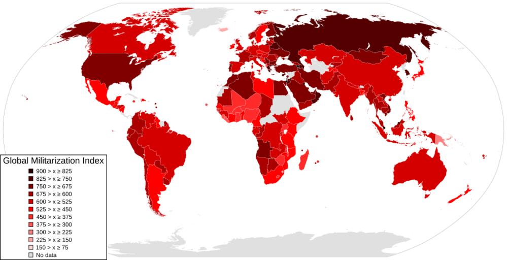 Keywords: 2014 world map of countries by Global Militarization Index.svg Editor's note This map is saved in human-editable plain text format to make updating easier for everyone Save and open with Notepad and simply cut and paste the country code from one class to another when updating then save and upload with a new file name for that year Robinson projection SVG map of world countries shaded by their Global Militarization Index for the year 2014; a measure of the weight and importance of a country's military to the society http //gmi bicc de/index php page ranking-table year 2014 BICC 2014 2015-12-04 Jolly Janner <gallery> File 2014 world map of countries by Global Militarization Index svg Global Militarization Index File 2014 world map of countries by Military Expenditure Index svg Military Expenditure Index File 2014 world map of countries by Military Personnel Index svg Military Personnel Index File 2014 world map of countries by Heavy Weapons Index svg Heavy Weapons Index </gallery> Militarization index maps of the world |