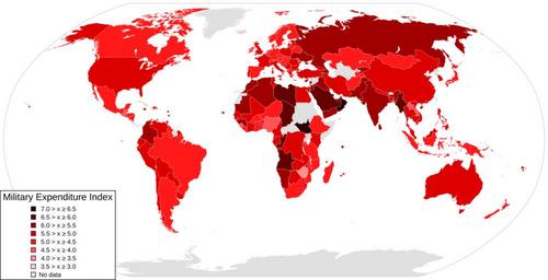 | Keywords: 2014 world map of countries by Military Expenditure Index.svg Editor's note This map is saved in human-editable plain text format to make updating easier for everyone Save and open with Notepad and simply cut and paste the country code from one class to another when updating then save and upload with a new file name for that year Robinson projection SVG map of world countries shaded by their Military Expenditure Index for the year 2014; a comparison of military expenditures with GDP and health expenditure http //gmi bicc de/index php page ranking-table year 2014 BICC 2014 2015-12-04 Jolly Janner <gallery> File 2014 world map of countries by Global Militarization Index svg Global Militarization Index File 2014 world map of countries by Military Expenditure Index svg Military Expenditure Index File 2014 world map of countries by Military Personnel Index svg Military Personnel Index File 2014 world map of countries by Heavy Weapons Index svg Heavy Weapons Index </gallery> Militarization index maps of the world |
