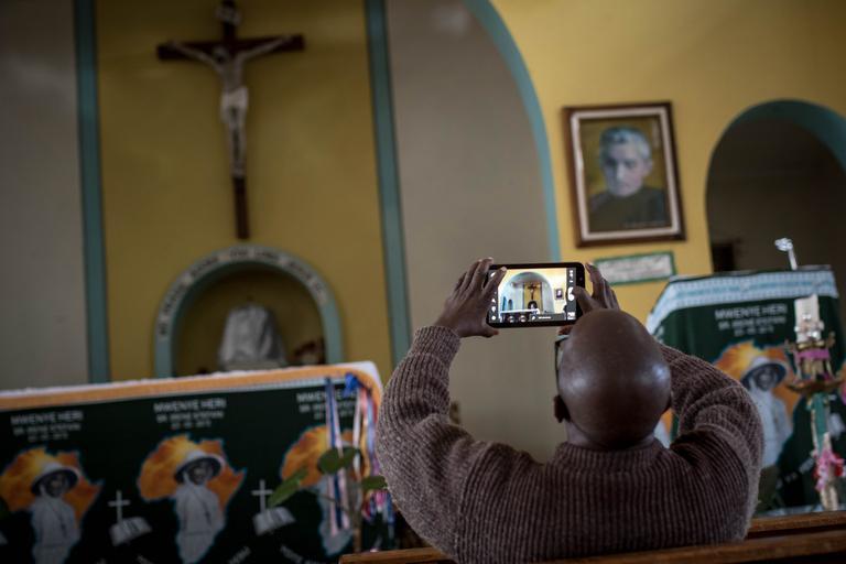Keywords: kenya nyeri africa roman catholic italy nun sister irene stefani sainthood missionary world war one beatification ceremony soldiers wounded tourism christian nuns faith religion indoor KENYA, Nyeri: In a photograph taken 21 May 2015, and made available by Make It Kenya, a man takes a photograph on a mobile device inside a church ahead of Kenya and Africa's first Roman Catholic beatification ceremony. Final preparations are being made to host thousands of worshippers, officials and visitors who are expected to congregate 23 May for the event in the town of Nyeri approx. 150 kilometers north of the Kenyan capital Nairobi. The ceremony is a critical step towards sainthood for Irene Stefani, an Italian nun and missionary who is beloved in Nyeri and its environs for her selfless service to wounded World War One soldiers and ailing locals alike. Sister Stefani arrived in Kenya in 1915 and gained fame over the following years for her generosity and extraordinary empathy. She died in 1930 after contracting plague. MANDATORY CREDIT: MAKE IT KENYA PHOTO / STUART PRICE. KENYA, Nyeri: In a photograph taken 21 May 2015, and made available by Make It Kenya, a man takes a photograph on a mobile device inside a church ahead of Kenya and Africa's first Roman Catholic beatification ceremony. Final preparations are being made to host thousands of worshippers, officials and visitors who are expected to congregate 23 May for the event in the town of Nyeri approx. 150 kilometers north of the Kenyan capital Nairobi. The ceremony is a critical step towards sainthood for Irene Stefani, an Italian nun and missionary who is beloved in Nyeri and its environs for her selfless service to wounded World War One soldiers and ailing locals alike. Sister Stefani arrived in Kenya in 1915 and gained fame over the following years for her generosity and extraordinary empathy. She died in 1930 after contracting plague. MANDATORY CREDIT: MAKE IT KENYA PHOTO / STUART PRICE.