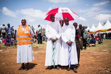 | Keywords: kenya nyeri africa roman catholic italy nun sister irene stefani nyaatha mathari gikoni sainthood missionary world war one beatification ceremony soldiers wounded tourism christian nuns faith religion outdoor KENYA, Nyeri: In a photograph taken 23 May 2015, and made available by Make It Kenya, priests shield themselves under an umbrella from the heat of the sun during a ceremony to mark he beatification of Sister Irene Stefani, an Italian nun and missionary who is beloved in Nyeri and its environs for her selfless service to wounded World War One soldiers and ailing locals alike. Thousands of Catholic faithful, clery, government officials, residents and visitors gathered in the Kenyan town of Nyeri today, 23 May, to witness Africa’s first beatification ceremony for Sister Stefani, who was known as Aurelia Jacoba Mercede until she joined the Consolata Missionary Sisters and changed her name in 1911. She arrived in Nyeri in 1915 and gained fame over the years for her genorosity and extraordinary empathy for the sick, wounded and aged. She died in 1930 at the age of 39, after contracting plague from infected patients that she insisted on treating. Catholic authorities say that reports of her kindness and a miracle attributed to her intercession, moved Pope Francis to approve preparations for her beatification in 2014. MANDATORY CREDIT: MAKE IT KENYA PHOTO / STUART PRICE. KENYA, Nyeri: In a photograph taken 23 May 2015, and made available by Make It Kenya, priests shield themselves under an umbrella from the heat of the sun during a ceremony to mark he beatification of Sister Irene Stefani, an Italian nun and missionary who is beloved in Nyeri and its environs for her selfless service to wounded World War One soldiers and ailing locals alike. Thousands of Catholic faithful, clery, government officials, residents and visitors gathered in the Kenyan town of Nyeri today, 23 May, to witness Africa’s first beatification ceremony for Sister Stefani, who was known as Aurelia Jacoba Mercede until she joined the Consolata Missionary Sisters and changed her name in 1911. She arrived in Nyeri in 1915 and gained fame over the years for her genorosity and extraordinary empathy for the sick, wounded and aged. She died in 1930 at the age of 39, after contracting plague from infected patients that she insisted on treating. Catholic authorities say that reports of her kindness and a miracle attributed to her intercession, moved Pope Francis to approve preparations for her beatification in 2014. MANDATORY CREDIT: MAKE IT KENYA PHOTO / STUART PRICE. |