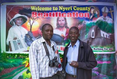 | Keywords: kenya nyeri africa roman catholic italy nun sister irene stefani nyaatha mathari gikoni sainthood missionary world war one beatification ceremony soldiers wounded tourism christian nuns faith religion KENYA, Nyeri: In a photograph taken 23 May 2015, and made available by Make It Kenya, two local photographers from Nyeri pose for a photograph inside their photo booth they had set up on the road to a ceremony to beatifiy Sister Irene Stefani, an Italian nun and missionary who is beloved in Nyeri and its environs for her selfless service to wounded World War One soldiers and ailing locals alike. Thousands of Catholic faithful, clery, government officials, residents and visitors gathered in the Kenyan town of Nyeri today, 23 May, to witness Africa’s first beatification ceremony for Sister Stefani, who was known as Aurelia Jacoba Mercede until she joined the Consolata Missionary Sisters and changed her name in 1911. She arrived in Nyeri in 1915 and gained fame over the years for her genorosity and extraordinary empathy for the sick, wounded and aged. She died in 1930 at the age of 39, after contracting plague from infected patients that she insisted on treating. Catholic authorities say that reports of her kindness and a miracle attributed to her intercession, moved Pope Francis to approve preparations for her beatification in 2014. MANDATORY CREDIT: MAKE IT KENYA PHOTO / STUART PRICE. KENYA, Nyeri: In a photograph taken 23 May 2015, and made available by Make It Kenya, two local photographers from Nyeri pose for a photograph inside their photo booth they had set up on the road to a ceremony to beatifiy Sister Irene Stefani, an Italian nun and missionary who is beloved in Nyeri and its environs for her selfless service to wounded World War One soldiers and ailing locals alike. Thousands of Catholic faithful, clery, government officials, residents and visitors gathered in the Kenyan town of Nyeri today, 23 May, to witness Africa’s first beatification ceremony for Sister Stefani, who was known as Aurelia Jacoba Mercede until she joined the Consolata Missionary Sisters and changed her name in 1911. She arrived in Nyeri in 1915 and gained fame over the years for her genorosity and extraordinary empathy for the sick, wounded and aged. She died in 1930 at the age of 39, after contracting plague from infected patients that she insisted on treating. Catholic authorities say that reports of her kindness and a miracle attributed to her intercession, moved Pope Francis to approve preparations for her beatification in 2014. MANDATORY CREDIT: MAKE IT KENYA PHOTO / STUART PRICE. |