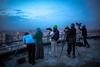 Keywords: kenya nairobi capital skyline sunset dusk night rooftop panorama city centre urban downtown central business district commerce kenyatta international conference kicc outdoor KENYA, Nairobi: A photograph taken by Make It Kenya 10 June 2015, shows a group of photography students on the top of the Kenyatta International Conference Centre (KICC) capturing the changing light of the Nairobi skyline as the sun sets over the Kenyan capital. MANDATORY CREDIT: MAKE IT KENYA PHOTO / STUART PRICE. KENYA, Nairobi: A photograph taken by Make It Kenya 10 June 2015, shows a group of photography students on the top of the Kenyatta International Conference Centre (KICC) capturing the changing light of the Nairobi skyline as the sun sets over the Kenyan capital. MANDATORY CREDIT: MAKE IT KENYA PHOTO / STUART PRICE.