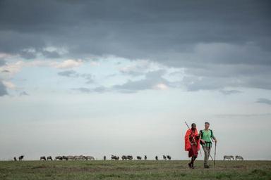 MAKE A MEME View Large Image Maasai Mara: In a photograph taken by Make It Kenya 23 June 2015, author and travel writer Stuart Butler and his Maasai guide and companion Josphat Mako walk past zebra and wildebeest as they cross the Mara North Conservancy adjacent to ...
