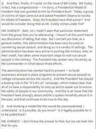 | Keywords: 2015-07-08 White House Press Secretary on Revoking Medal of Freedom from Bill Cosby.jpg Q And then finally if I could on the issue of Bill Cosby Bill Cosby in fact has a congressional -- I'm sorry a Presidential Medal of Freedom that was granted to him by President Bush Today a group of victims of rape came out and asked President Obama to revoke his Medal of Freedom Does the President have that power And would he consider doing that as Mr Cosby comes under fire MR EARNEST Well Jim I hadn ™t seen that particular statement from the group that you ™re referencing I haven ™t at this point heard any discussion of taking that step But I can tell you that as a general matter this administration has been very focused on countering sexual assault and doing so in a variety of settings The administration has been very active in pushing the military who to their credit has taken some important steps to root out sexual assault in the military The President has spoken very forcefully as the Commander-in-Chief about those efforts The administration has worked hard to prevent -- to build awareness and put in place programs to prevent sexual assault on college campuses across the country And the President has played a leading role in the It ™s On Us campaign which makes clear that all of us have a responsibility to step up and to speak out to ensure the safety of people in our community And this is an issue that the President feels strongly about and he ™s spoken forcefully about it in the past and that continues to be true to this day Q And revoking a medal like this would be unprecedented I understand Is it possible do you know Is it legally possible for it to be pulled back MR EARNEST I don ™t know the answer to that but we can look into that for you Q Follow-up question please Josh MR EARNEST I ™ll come back to you April Q Josh I want to go back to what Jim asked With your answer it seems this administration is well aware of the news reports about Bill Cosby this iconic man who now -- information has been released that he indeed gave Quaaludes to women What is the President saying about this particularly as he is someone who has promoted women and girls And as you said he has fought against issues of sexual assault in the military and on college campuses What is he personally saying about this as Bill Cosby is an iconic person throughout the years and globally not just in the United States MR EARNEST I believe the last time the President talked about this was he was asked about it in an interview with Univision back in December So you can take a look at the President ™s comments at that point I haven ™t spoken to him since these latest revelations that were reported publicly in the last couple of days Q But with this -- and going back to Jim ™s question -- is it out of the realm of possibility Because of this -- and again the times that we're in the fact that there is a push for women and girls in this administration and the fact that you are countering sexual assaults -- with somebody like this this could be a very big statement Would the administration consider revoking his medal from the White House from the Bush administration MR EARNEST Well as I mentioned to Jim I don't know whether or not it ™s legally possible to do so But -- Q Can you investigate the possibility because again of what I asked MR EARNEST Well I ™ll see if we can get an answer to the question that you ™ve asked https //www whitehouse gov/the-press-office/2015/07/08/press-briefing-press-secretary-josh-earnest-7815 www whitehouse gov 2015-07-08 The White House Public Domain Revoke the Presidential Medal of Freedom from Bill Cosby PD-USGov Bill Cosby in 2015 Bill Cosby-related documents Bill Cosby sexual assault allegations Revoke the Presidential Medal of Freedom from Bill Cosby |