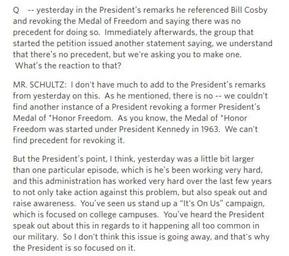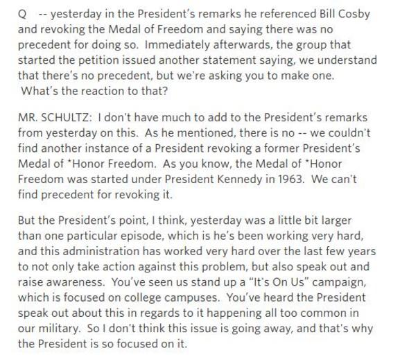 | Keywords: 2015-07-16 White House Principal Deputy Press Secretary on Revoking Medal of Freedom from Bill Cosby.jpg Q -- yesterday in the President ™s remarks he referenced Bill Cosby and revoking the Medal of Freedom and saying there was no precedent for doing so Immediately afterwards the group that started the petition issued another statement saying we understand that there ™s no precedent but we're asking you to make one What ™s the reaction to that MR SCHULTZ I don't have much to add to the President ™s remarks from yesterday on this As he mentioned there is no -- we couldn't find another instance of a President revoking a former President ™s Medal of Honor Freedom As you know the Medal of Honor Freedom was started under President Kennedy in 1963 We can't find precedent for revoking it But the President ™s point I think yesterday was a little bit larger than one particular episode which is he ™s been working very hard and this administration has worked very hard over the last few years to not only take action against this problem but also speak out and raise awareness You ™ve seen us stand up a It's On Us campaign which is focused on college campuses You ™ve heard the President speak out about this in regards to it happening all too common in our military So I don't think this issue is going away and that's why the President is so focused on it https //www whitehouse gov/the-press-office/2015/07/16/press-gaggle-principal-deputy-press-secretary-eric-schultz-en-route www whitehouse gov 2015-07-16 The White House Public Domain Revoke the Presidential Medal of Freedom from Bill Cosby PD-USGov Bill Cosby in 2015 Bill Cosby-related documents Bill Cosby sexual assault allegations Revoke the Presidential Medal of Freedom from Bill Cosby |