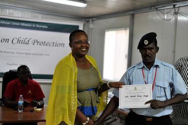 Keywords: The Deputy Special Representative of the Chairperson of the African Union Commission (DSRCC) for Somalia, Lydia Wanyoto hands over a certificate to an officer from Somali Police Force during the closing ceremony of a training on child protection for AMISOM peace keepers and Somali Security forces held in Mogadishu, Somalia on September 04 2015. The training was conducted by the AMISOM Protection and Human Rights Unit. AMISOM Photo / Ilyas Ahmed The Deputy Special Representative of the Chairperson of the African Union Commission (DSRCC) for Somalia, Lydia Wanyoto hands over a certificate to an officer from Somali Police Force during the closing ceremony of a training on child protection for AMISOM peace keepers and Somali Security forces held in Mogadishu, Somalia on September 04 2015. The training was conducted by the AMISOM Protection and Human Rights Unit. AMISOM Photo / Ilyas Ahmed