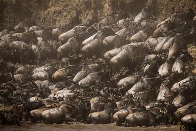 | Keywords: outdoor monochrome KENYA, Masai Mara: In a photograph taken by Make It Kenya 29 September 2015, a large group of wildebeest struggle to climb the wet, sandy bank of the Mara River having swam across it in Kenya's world famous Masai Mara National Reserve. Every year, hundreds of thousands of wildebeest, zebra and other ungulate animals migrate between Tanzania's Serengeti and Kenya's Masai Mara in a year-long, continuous cycle, which sees the animals travel thousands of kilometres and is known as one of the seven natural wonders of the world, and is a major draw for wildlife enthusiasts and tourists from around the world. MANDATORY CREDIT: MAKE IT KENYA PHOTO / STUART PRICE. KENYA, Masai Mara: In a photograph taken by Make It Kenya 29 September 2015, a large group of wildebeest struggle to climb the wet, sandy bank of the Mara River having swam across it in Kenya's world famous Masai Mara National Reserve. Every year, hundreds of thousands of wildebeest, zebra and other ungulate animals migrate between Tanzania's Serengeti and Kenya's Masai Mara in a year-long, continuous cycle, which sees the animals travel thousands of kilometres and is known as one of the seven natural wonders of the world, and is a major draw for wildlife enthusiasts and tourists from around the world. MANDATORY CREDIT: MAKE IT KENYA PHOTO / STUART PRICE. |