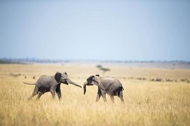 Keywords: outdoor animal landscape field KENYA, Masai Mara: In a photograph taken by Make It Kenya 03 October 2015, two young elephants spar with each other on the savannah in the Mara Triangle, part of Kenya's wider Masai Mara ecosystem. During the months of July through to October, one of nature's greatest events takes place in the Mara when hundreds of thousands of wildebeest, zebra and other ungulates migrate northwards from Tanzania's Serengeti in search of fresh pasture and grazing, before turning and heading south again in a journey that covers thousands of kilometres and is known as one of the seven natural wonders of the world, making it a major draw for wildlife enthusiasts and tourists from around the globe. MANDATORY CREDIT: MAKE IT KENYA PHOTO / STUART PRICE. KENYA, Masai Mara: In a photograph taken by Make It Kenya 03 October 2015, two young elephants spar with each other on the savannah in the Mara Triangle, part of Kenya's wider Masai Mara ecosystem. During the months of July through to October, one of nature's greatest events takes place in the Mara when hundreds of thousands of wildebeest, zebra and other ungulates migrate northwards from Tanzania's Serengeti in search of fresh pasture and grazing, before turning and heading south again in a journey that covers thousands of kilometres and is known as one of the seven natural wonders of the world, making it a major draw for wildlife enthusiasts and tourists from around the globe. MANDATORY CREDIT: MAKE IT KENYA PHOTO / STUART PRICE.