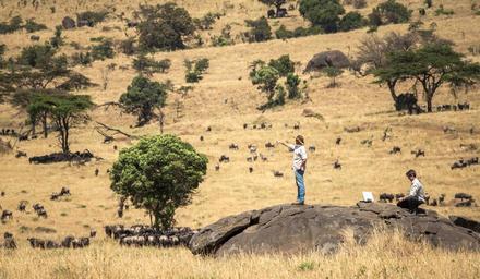 Keywords: outdoor KENYA, Masai Mara: In a photograph taken by Make It Kenya 04 October 2015, Carel Verhoef (left) and Andre Van Kets, co-founders of HerdTracker, prepare for a live broadcast on the Twitter application Periscope below the Oloololo Escarpment in the Mara Triangle, part of Kenya's wider Masai Mara ecosystem. During the months of July through to October, one of nature's greatest events takes place in the Mara when hundreds of thousands of wildebeest, zebra and other ungulates migrate northwards from Tanzania's Serengeti in search of fresh pasture and grazing, before turning and heading south again in a journey that covers thousands of kilometres and is known as one of the seven natural wonders of the world, making it a major draw for wildlife enthusiasts and tourists from around the globe. MANDATORY CREDIT: MAKE IT KENYA PHOTO / STUART PRICE. KENYA, Masai Mara: In a photograph taken by Make It Kenya 04 October 2015, Carel Verhoef (left) and Andre Van Kets, co-founders of HerdTracker, prepare for a live broadcast on the Twitter application Periscope below the Oloololo Escarpment in the Mara Triangle, part of Kenya's wider Masai Mara ecosystem. During the months of July through to October, one of nature's greatest events takes place in the Mara when hundreds of thousands of wildebeest, zebra and other ungulates migrate northwards from Tanzania's Serengeti in search of fresh pasture and grazing, before turning and heading south again in a journey that covers thousands of kilometres and is known as one of the seven natural wonders of the world, making it a major draw for wildlife enthusiasts and tourists from around the globe. MANDATORY CREDIT: MAKE IT KENYA PHOTO / STUART PRICE.