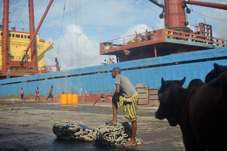 | Keywords: outdoor A Somali cattle herder helps tend to the cattle as it is readied to be loaded onto a ship in Mogadishu's port on October 29. The cattle is destined for the port of Muscat in Oman. AMISOM Photo / Tobin Jones A Somali cattle herder helps tend to the cattle as it is readied to be loaded onto a ship in Mogadishu's port on October 29. The cattle is destined for the port of Muscat in Oman. AMISOM Photo / Tobin Jones | ||||