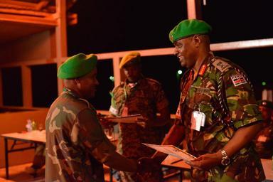 | Keywords: The Force Commander of the African Union Mission in Somalia (AMISOM), Lt. Gen. Jonathan Rono, hands a certificate to a Soldier from one of four Troop Contributing Countries (TCC) and one Mission Supporting Country (MSC), serving under African Union Mission in Somalia (AMISOM), during a farewell ceremony to mark the end of their tour of duty in Somalia on October 31, 2015. AMISOM Photo/Omar Abdisalann The Force Commander of the African Union Mission in Somalia (AMISOM), Lt. Gen. Jonathan Rono, hands a certificate to a Soldier from one of four Troop Contributing Countries (TCC) and one Mission Supporting Country (MSC), serving under African Union Mission in Somalia (AMISOM), during a farewell ceremony to mark the end of their tour of duty in Somalia on October 31, 2015. AMISOM Photo/Omar Abdisalann |