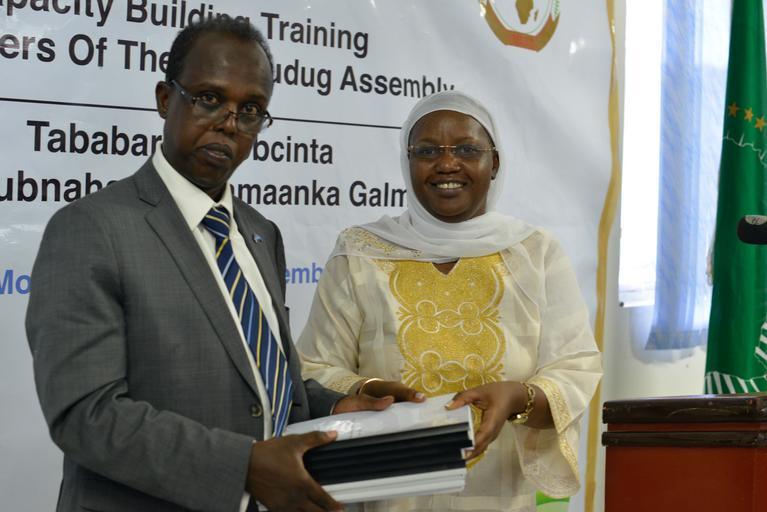 Keywords: people The Deputy Special Representative of the Chairperson of the African Union Commission (DSRCC) for Somalia, Lydia Wanyoto, hands books to Hared Ali Hared, the Deputy Speaker of the Galmudug Regional Assembly at the end of five days capacity building workshop held in Mogadishu, Somalia from 21 to 25 November 2015. The workshop was supported by the African Union Mission in Somalia (AMISOM). AMISOM Photo / Omar Abdisalan The Deputy Special Representative of the Chairperson of the African Union Commission (DSRCC) for Somalia, Lydia Wanyoto, hands books to Hared Ali Hared, the Deputy Speaker of the Galmudug Regional Assembly at the end of five days capacity building workshop held in Mogadishu, Somalia from 21 to 25 November 2015. The workshop was supported by the African Union Mission in Somalia (AMISOM). AMISOM Photo / Omar Abdisalan |