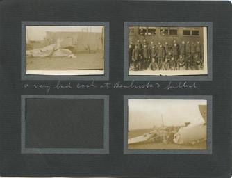 | Keywords: 1910s world war i worldwari royal flying corps royalflyingcorps royal air force royalairforce trains crashes aircraft "a very bad crash at Benbrook [Texas] 3 killed" photos of crashes and a photo of men standing in front of a railway car. Photographs taken by Harry McBride (1893-1969), who worked as a rigger in the Royal Flying Corps and Royal Air Force during the First World War. He was stationed at Camp Mohawk near Deseronto, Ontario, and also at Camp Taliaferro near Fort Worth, Texas. Scanned images donated to the Archives by Dan McBride, Harry's grandson. "a very bad crash at Benbrook [Texas] 3 killed" photos of crashes and a photo of men standing in front of a railway car. Photographs taken by Harry McBride (1893-1969), who worked as a rigger in the Royal Flying Corps and Royal Air Force during the First World War. He was stationed at Camp Mohawk near Deseronto, Ontario, and also at Camp Taliaferro near Fort Worth, Texas. Scanned images donated to the Archives by Dan McBride, Harry's grandson. |