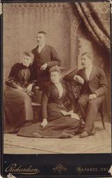 | Keywords: 1890s portraits men women clothes Photographic portrait of James Gaulin and his wife, Elizabeth Jane Nealon (on left). Possibly taken on their wedding day: they married on January 19th, 1892 in Napanee. The other two people could be the witnesses to their marriage, Mary Flood and Edward Gaulin (James's brother), both of Deseronto, Ontario. The photograph was taken by Richardson of Napanee, Ontario. Gaulin was the postmaster in Deseronto in the first 20 years of the twentieth century. He was born on May 1st, 1870 and died in his residence on the corner of St. George Street and Thomas Street on June 2nd, 1920. Loaned for scanning by Gaulin's grand-daughter, Marie McCartney in August 2015. Photographic portrait of James Gaulin and his wife, Elizabeth Jane Nealon (on left). Possibly taken on their wedding day: they married on January 19th, 1892 in Napanee. The other two people could be the witnesses to their marriage, Mary Flood and Edward Gaulin (James's brother), both of Deseronto, Ontario. The photograph was taken by Richardson of Napanee, Ontario. Gaulin was the postmaster in Deseronto in the first 20 years of the twentieth century. He was born on May 1st, 1870 and died in his residence on the corner of St. George Street and Thomas Street on June 2nd, 1920. Loaned for scanning by Gaulin's grand-daughter, Marie McCartney in August 2015. |