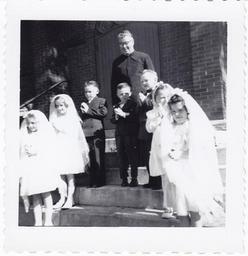 | Keywords: children churches clothes 1950s blackandwhite black and white Photograph taken outside St. Vincent de Paul church in Deseronto, Ontario, in 1954 or 1955 at the First Communion of (from left) Marie Murphy, Carol Lord, Joseph Smith, ?, Tom Dowling, Sharon O'Brien and Colleen [Bennett?]. The priest was Father Martin. Loaned for scanning by Marie McCartney in August 2015. Photograph taken outside St. Vincent de Paul church in Deseronto, Ontario, in 1954 or 1955 at the First Communion of (from left) Marie Murphy, Carol Lord, Joseph Smith, ?, Tom Dowling, Sharon O'Brien and Colleen [Bennett?]. The priest was Father Martin. Loaned for scanning by Marie McCartney in August 2015. |