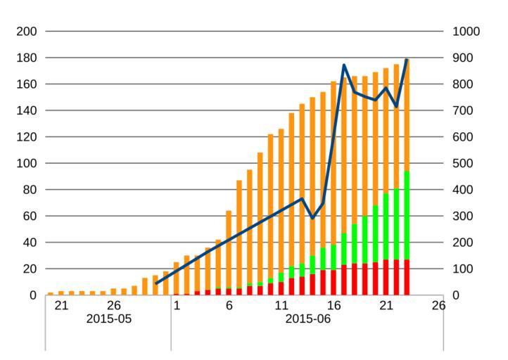 | Keywords: 2015 MERS in South Korea2.svg en Orange bar patients; Green bar cured; Red bar deaths; Blue line isolated right ja 橙棒:治療中 緑棒:生還 赤棒:死去 線(右目盛):病院隔離 2015-06-20 own Akaniji other versions cc-zero Data table wikitable colspan 2 rowspan 2 Date colspan 4 Cases colspan 2 Quarantined rowspan 2 refs <ref>http //www mw go kr/front_new/al/sal0301ls jsp PAR_MENU_ID 04 MENU_ID 0403</ref><ref name mwgokr323404>http //www mw go kr/front_new/al/sal0301vw jsp PAR_MENU_ID 04 MENU_ID 0403 CONT_SEQ 323404</ref> - total Patients Cured Deaths Isolated total - rowspan 12 May 20 2 2 0 0 - 21 3 3 0 0 64 <ref>Paul Tait UPDATE 3-South Korea confirms third case of MERS virus; 64 isolated Reuters May 21 2015 4 48am EDT http //www reuters com/article/2015/05/21/health-mers-southkorea-idUSL3N0YC15220150521 </ref> - 22 3 3 0 0 - 23 3 3 0 0 - 24 3 3 0 0 - 25 3 3 0 0 - 26 5 5 0 0 - 27 5 5 0 0 - 28 7 7 0 0 - 29 13 13 0 0 120 <ref>AFP News S Korea confirms 12 MERS cases Yahoo News Singapore Fri May 29 2015 https //sg news yahoo com/korea-reports-three-mers-cases-093430653 html </ref><ref>Jung Min-ho Korean diagnosed with MERS in China Korea Times May 29 2015 http //www koreatimes co kr/www/news/nation/2015/05/116_179826 html </ref> - 30 15 15 0 0 42 <ref>Kim Se-jeong MERS cases rise to 15; soldier quarantined Korea Times 2015-05-31 17 08 2015-05-31 21 55 updated http //www koreatimes co kr/www/news/nation/2015/06/116_179897 html </ref> - 31 18 18 0 0 - rowspan 23 June 1 25 24 0 1 682 <ref>Nearly 700 Quarantined Over Lethal MERS Virus skyNEWS Sky UK 16 47 UK 01 June 2015 http //news sky com/story/1494407/nearly-700-quarantined-over-lethal-mers-virus </ref> - 2 30 29 0 1 791 <ref name kjd150604>KIM BONG-MOON Schools choose to close as MERS keeps spreading Korea JoongAng Daily June 04 2015 http //koreajoongangdaily joins com/news/article/Article aspx aid 3004971 </ref> - 3 30 27 0 3 1364 <ref name kjd150604 /> - 4 36 32 0 4 164 1667 <ref>Xinhua MERS infections in S Korea keep rising to 35 in two weeks Shanghai Daily Jun 04 2015 http //www shanghaidaily com/article/article_xinhua aspx id 285708 </ref> - 5 42 36 1 5 1820 <ref>Jean Noh S Korea's NEW holds film release over Mers outbreak ScreenDaily 5 June 2015 http //www screendaily com/screenasia/s-koreas-new-holds-film-release-over-mers-outbreak/5089107 article </ref> - 6 64 58 1 5 1801 <ref>Reuters Jeremy Laurence South Korea reports nine new MERS cases one recovers and leaves hospital Channel NewsAsia 06 Jun 2015 13 10 http //www channelnewsasia com/news/asiapacific/south-korea-reports-nine/1896498 html </ref> - 7 87 81 1 5 2508 <ref>Yamei Wang Central municipal authorities in S Korea to cooperate in tackling MERS Xinhua English news cn 2015-06-07 17 48 38 http //news xinhuanet com/english/2015-06/07/c_134304733 htm </ref> - 8 95 86 2 7 2892 <ref name reuters150609>Ju-min Park and James Pomfret Hong Kong issues 'red alert' against South Korea travel due to MERS Reuters Jun 9 2015 4 30pm EDT http //www reuters com/article/2015/06/09/health-mers-southkorea-idUSKBN0ON02D20150609 </ref> - 9 108 98 3 7 3439 <ref name reuters150609 /> - 10 122 109 4 9 3805 <ref name afp1506121040>Agence France-Presse Number of New MERS Cases in South Korea Falling Government NDTV June 12 2015 10 40 IST http //www ndtv com/world-news/number-of-new-mers-cases-in-south-korea-falling-government-770970 </ref> - 11 126 109 7 10 3680 <ref name afp1506121040 /> - 12 138 116 9 13 4000 <ref>Jack Kim WHO says South Korea's MERS outbreak large and complex Reuters Jun 13 2015 2 07pm BST http //uk reuters com/article/2015/06/13/uk-health-mers-southkorea-idUKKBN0OS2HE20150613 </ref> - 13 145 121 10 14 365 4856 <ref>Jack Kim Hospital at centre of South Korea's MERS suspends services; seven new cases Reuters Jun 14 2015 8 47am BST http //uk reuters com/article/2015/06/14/uk-health-mers-southkorea-idUKKBN0OT0XP20150614 </ref> - 14 150 120 14 16 291 5216 <ref name mwgokr323404 /> - 15 154 118 17 19 348 5586 - 16 162 124 19 19 598 6508 - 17 165 118 24 23 872 6729 - 18 166 112 30 24 769 5930 - 19 166 106 36 24 752 5197 - 20 169 101 43 25 739 4035 - 21 172 95 50 27 785 3833 - 22 175 94 54 27 714 2805 - 23 179 85 67 27 896 3103 Notes <references /> Uploaded with UploadWizard MERS 2015 in South Korea |