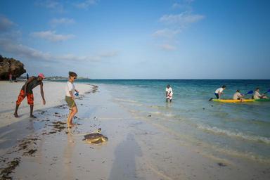 | Keywords: landscape beach shore seaside outdoor coast water ocean sand swim sport KENYA, Watamu: In a photograph taken by Make It Kenya 17 January 2016, a green sea turtle with a detachable GoPro camera mounted on it's carapace makes its way down a beach in Watamu and back into the Indian Ocean. In a world first, the event was streamed over the internet, broadcast on Twitter's Periscope application as the sea turtle entered the surf and swam back out into open water. Kenya's famous wildlife and beautiful tropical coastline was for two weeks being showcased in a series of live web broadcasts using state-of–the-art technology. #KenyaLive enabled people to witness the excitement of a night safari in the Mara in real time using specialist night-vision equipment as well as the release and first moments back in the wild of rehabilitated sea turtles which had accidentally been caught in fishing nets along the Watamu coast. The series of broadcasts highlighted the work of the LOT turtle conservation organisation, in addition to the many other and varied activities Watamu has to offer including stand-up paddle boarding with dolphins, snorkelling and scuba diving, all broadcast live by HerdTracker and Make It Kenya using the social media application Periscope. MAKE IT KENYA PHOTO / STUART PRICE. KENYA, Watamu: In a photograph taken by Make It Kenya 17 January 2016, a green sea turtle with a detachable GoPro camera mounted on it's carapace makes its way down a beach in Watamu and back into the Indian Ocean. In a world first, the event was streamed over the internet, broadcast on Twitter's Periscope application as the sea turtle entered the surf and swam back out into open water. Kenya's famous wildlife and beautiful tropical coastline was for two weeks being showcased in a series of live web broadcasts using state-of–the-art technology. #KenyaLive enabled people to witness the excitement of a night safari in the Mara in real time using specialist night-vision equipment as well as the release and first moments back in the wild of rehabilitated sea turtles which had accidentally been caught in fishing nets along the Watamu coast. The series of broadcasts highlighted the work of the LOT turtle conservation organisation, in addition to the many other and varied activities Watamu has to offer including stand-up paddle boarding with dolphins, snorkelling and scuba diving, all broadcast live by HerdTracker and Make It Kenya using the social media application Periscope. MAKE IT KENYA PHOTO / STUART PRICE. |