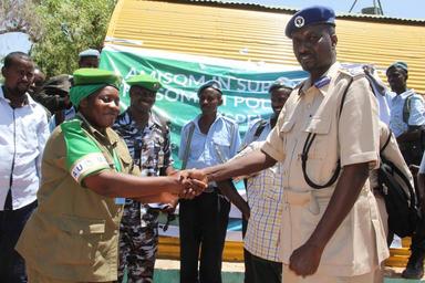 | Keywords: outdoor The Deputy Police Commissioner of the African Union Mission in Somalia (AMISOM), Christine Alalo shakes hands with Col. Isaak Ali Abdulle, Hiiraan Police Commissioner during a a ceremony to hand over a renovated police station for the Somali Police Force (SPF) held in Mahas, Hiiraan region on March 20, 2016. AMISOM Photo The Deputy Police Commissioner of the African Union Mission in Somalia (AMISOM), Christine Alalo shakes hands with Col. Isaak Ali Abdulle, Hiiraan Police Commissioner during a a ceremony to hand over a renovated police station for the Somali Police Force (SPF) held in Mahas, Hiiraan region on March 20, 2016. AMISOM Photo |