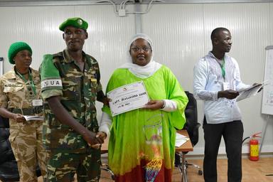 Keywords: The Deputy Special Representative of the Chairperson of the African Union Commission (DSRCC) for Somalia, Lydia Wanyoto, hands over a certificate one of the soldiers serving under the African Union Mission in Somalia (AMISOM) after completing a two-day training on Human Rights for AMISOM Senior and middle level officers conducted by the AMISOM Protection, Human Rights and Gender Unit, on November 18, 2016. AMISOM Photo/ Omar Abdsalan The Deputy Special Representative of the Chairperson of the African Union Commission (DSRCC) for Somalia, Lydia Wanyoto, hands over a certificate one of the soldiers serving under the African Union Mission in Somalia (AMISOM) after completing a two-day training on Human Rights for AMISOM Senior and middle level officers conducted by the AMISOM Protection, Human Rights and Gender Unit, on November 18, 2016. AMISOM Photo/ Omar Abdsalan